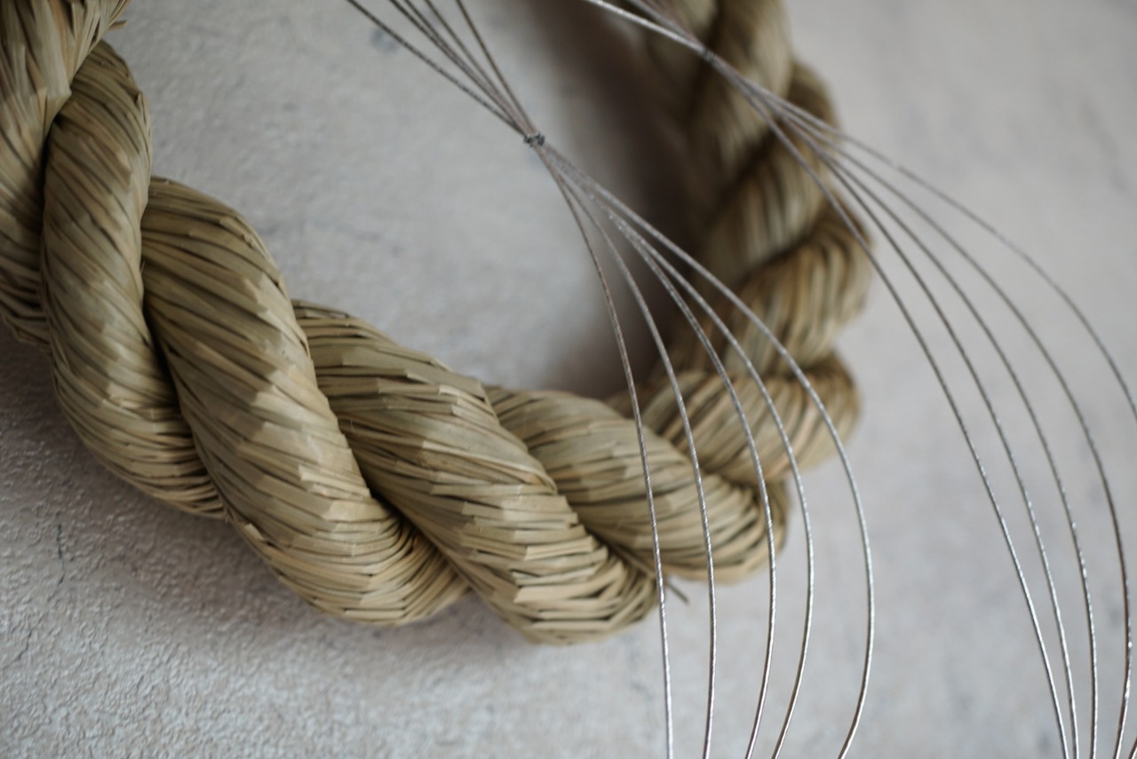 天然のワラのしめ縄に、銀の水引をアクセントに使用しています。