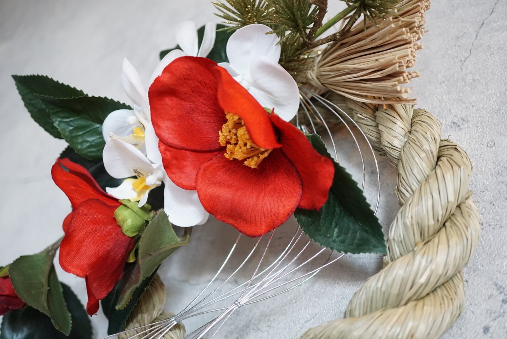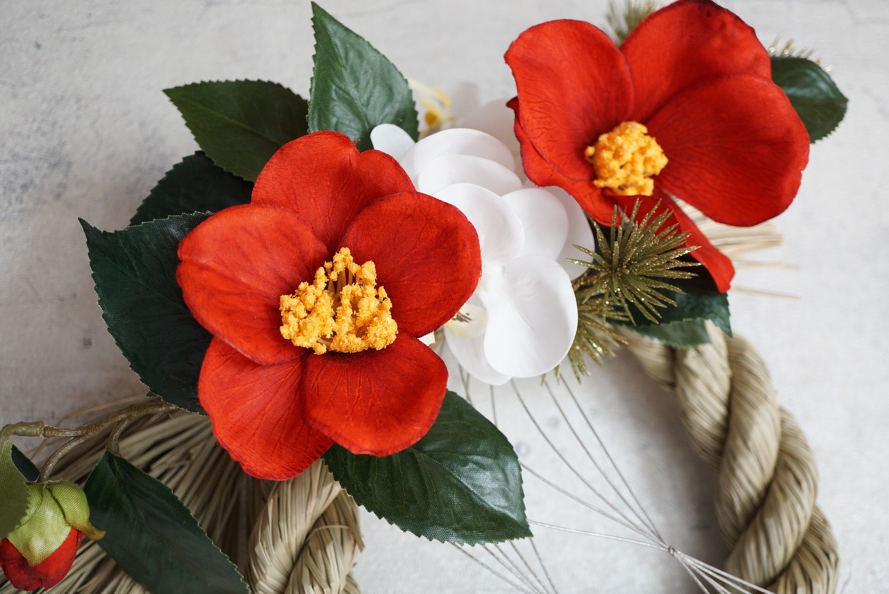 存在感のある紅白の椿をたっぷり使用したおめでたい雰囲気のお正月用のアレンジです。