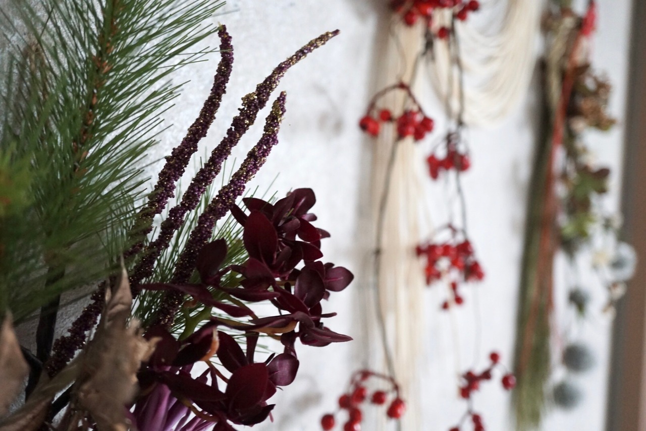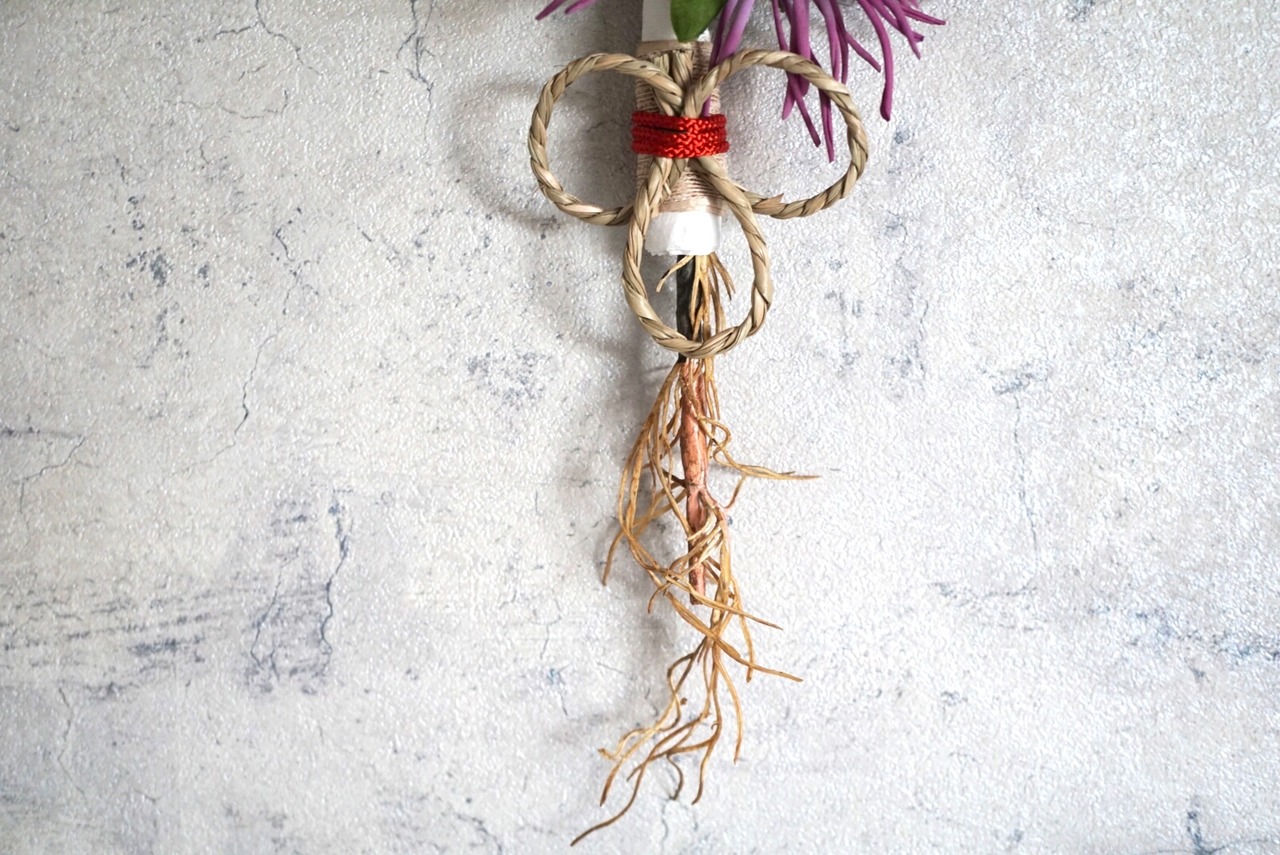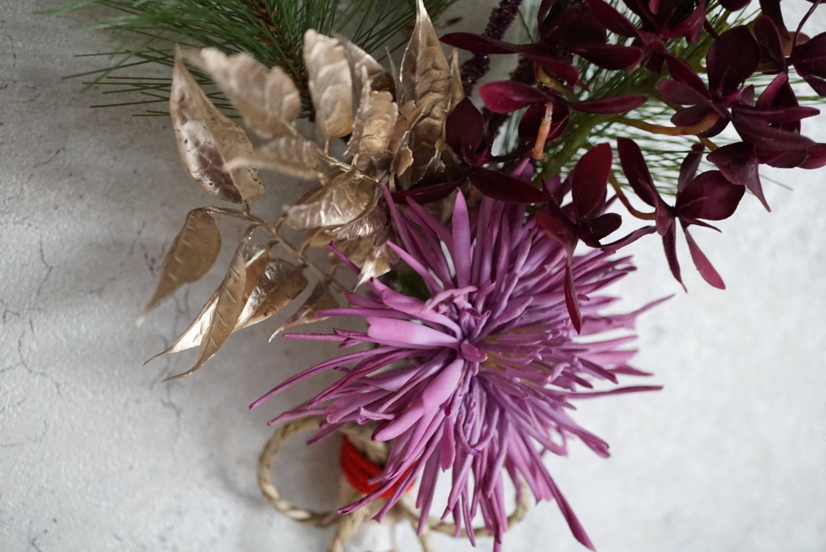 そんな根引松に、迫力のある大きな菊、縁起の良い蘭や、スワッグの花材に人気のアマランサスなどのアーティフィシャルフラワー(高級造花)や水引を飾り、上品なお正月飾りに仕上げました。