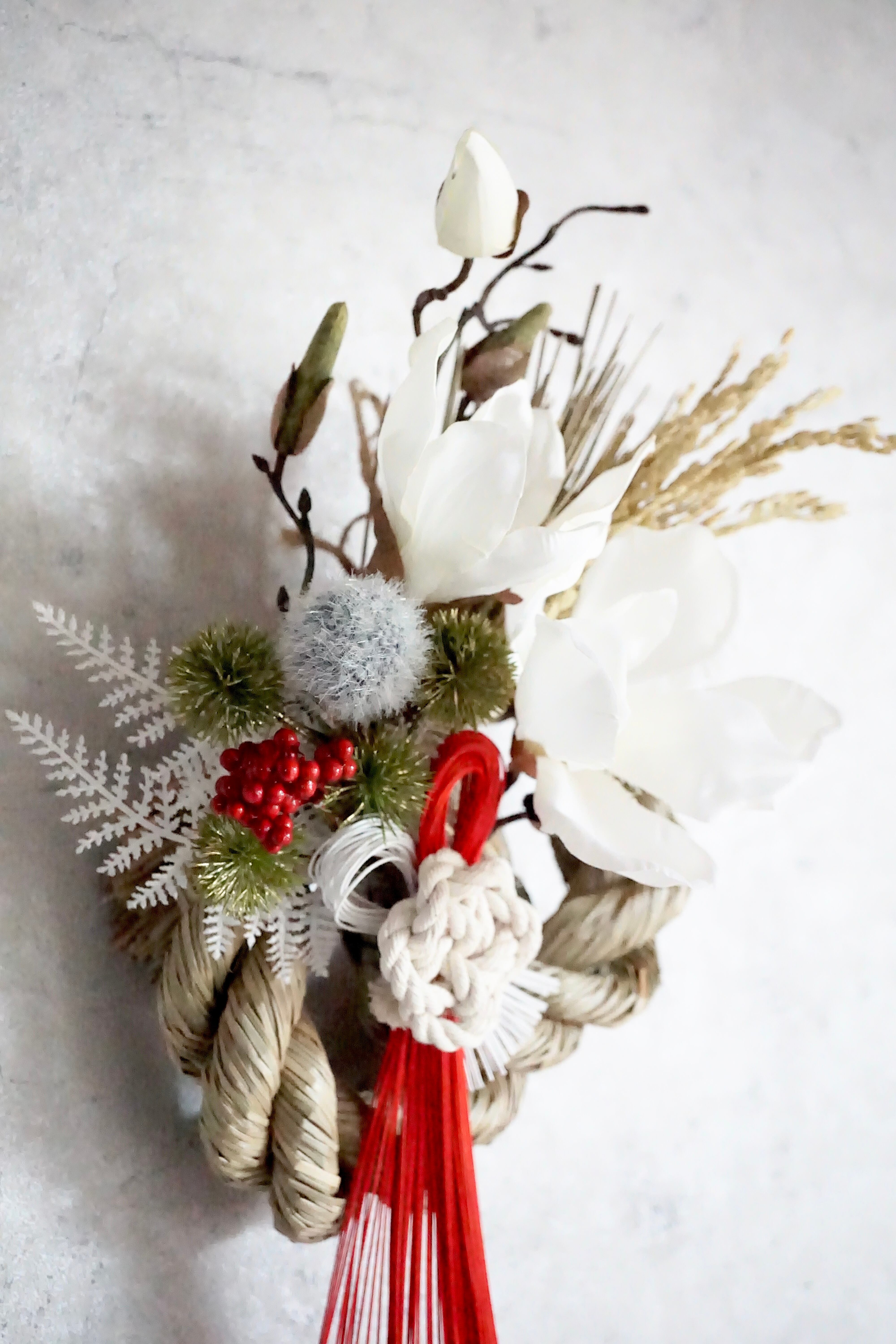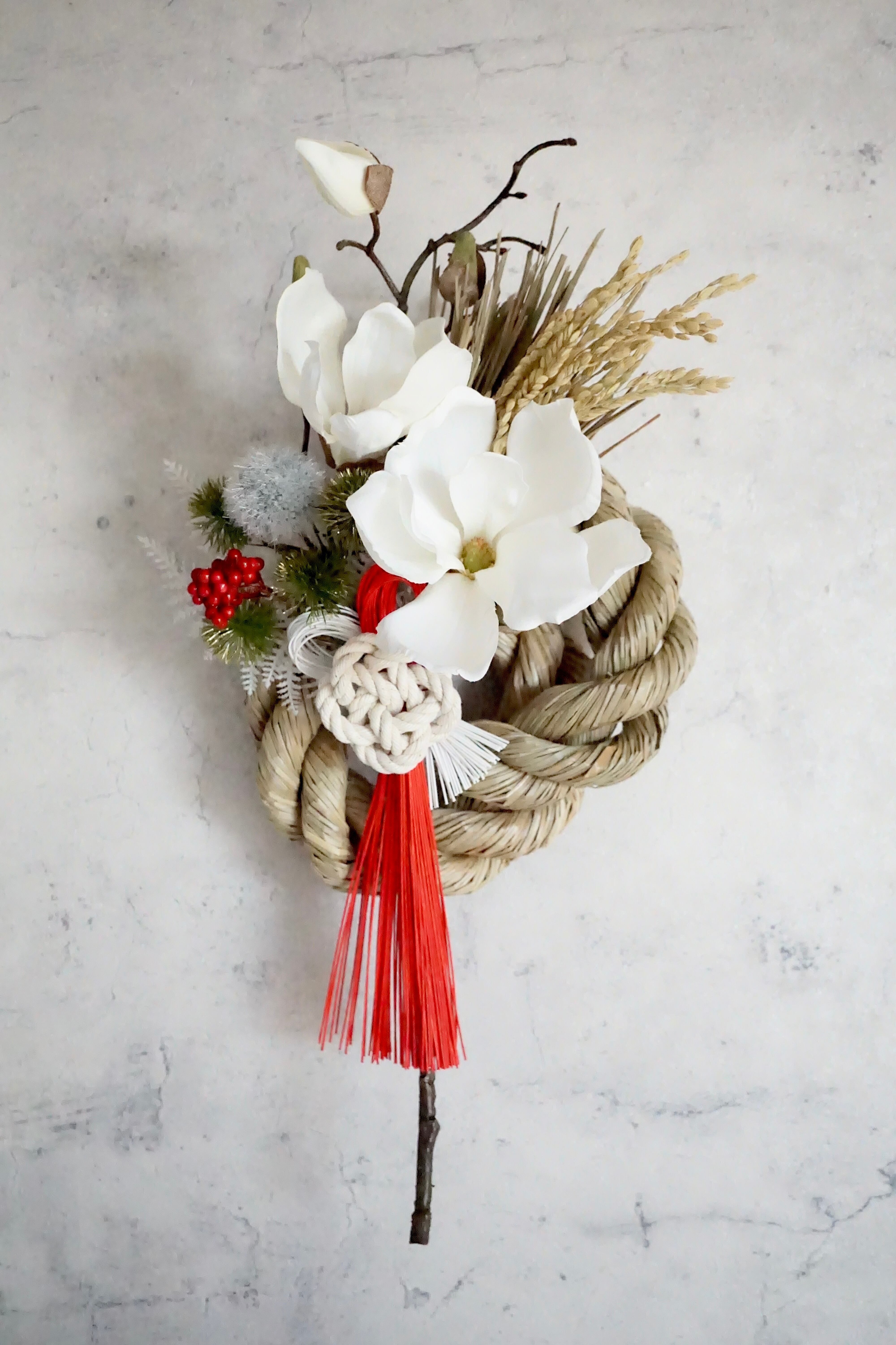 2重に重ねた存在感のある天然のワラと稲穂のしめ縄を使用し、「晴れ」を表す白と赤の水引をメインに縁起が良く華やかなアーティフィシャルフラワー(上質な造花)を飾っています。